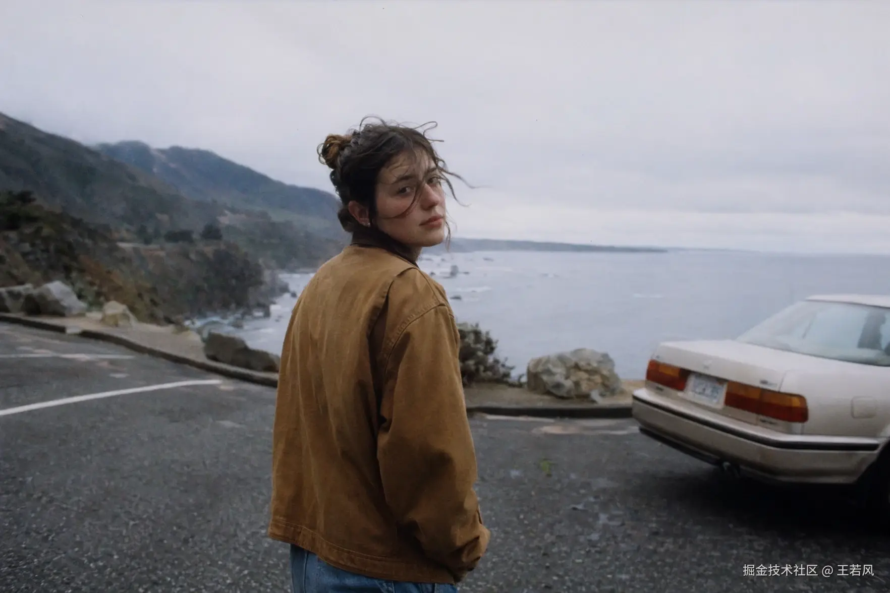 一张照片级真实的旅行抓拍场景:一个人站在海边公路边上的停车观景台,阴天的早晨,用 35mm 胶片拍摄。自然不完美的构图,可见的胶片颗粒,环境光,低饱和色调,衣服和头发被风吹动,电影般的真实感,一张有生活气息的纪实摄影照片的感觉。