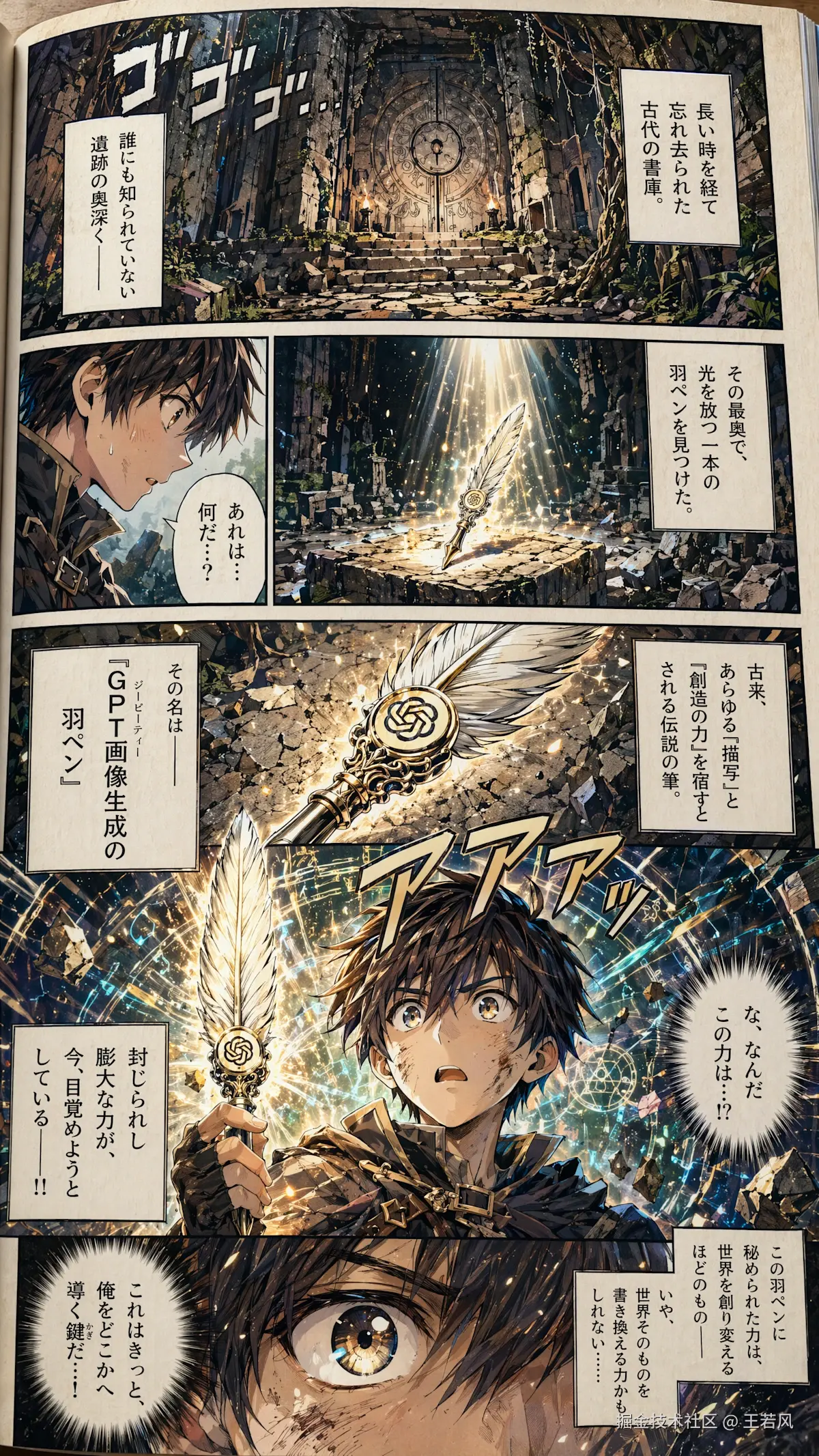 制作一页上色的日本少年冒险漫画样稿。画面要生动地描绘主角发现了一支魔法羽毛笔。这支笔叫做”Quill of GPT Image”。要有戏剧张力。这支魔法羽毛笔内封印着强大的力量。