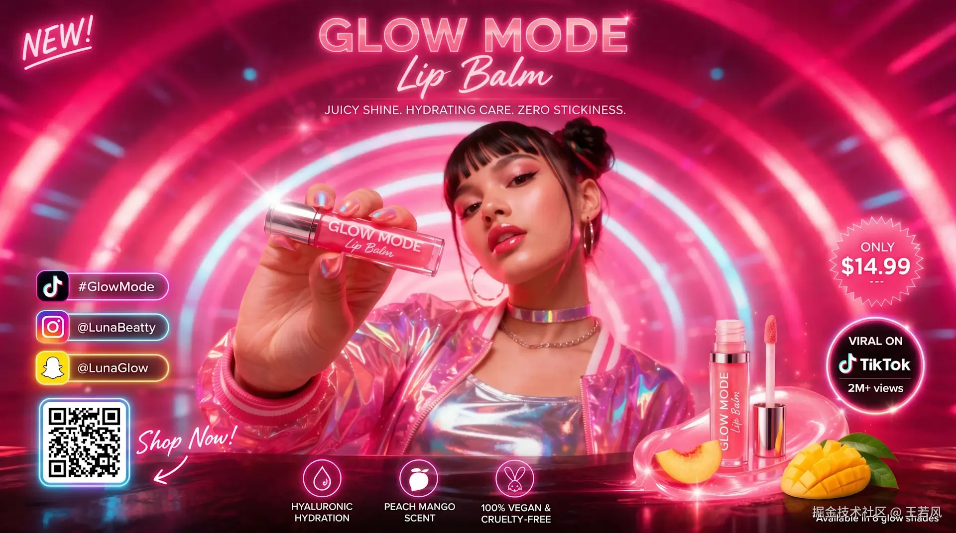 一位时尚名人即将推出新款发光唇膏。目标受众 14-30 岁。为这个受众群体设计一则广告。必须时尚且吸引这个年龄段。看起来要像专业拍摄。模特要酷、潮、有型。设计风格简洁美学。要有高端奢华感。