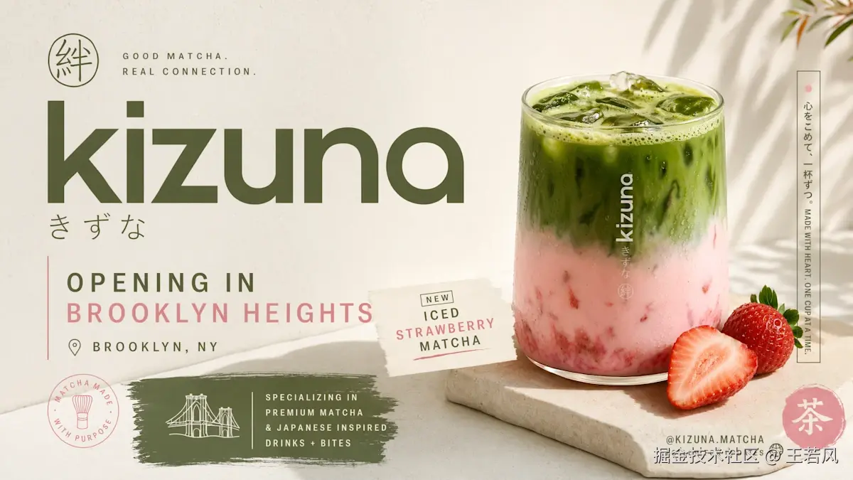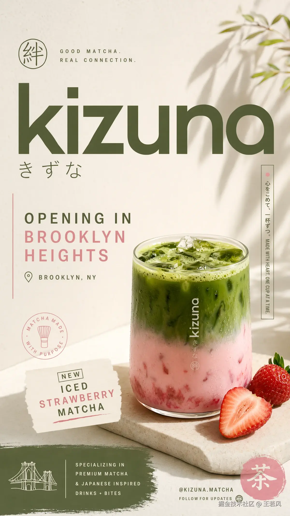 为我的新抹茶店”Kizuki”在布鲁克林高地开业制作一组广告。要有一张阳光感十足的草莓抹茶(冰)照片,街头潮流风格搭配日式简约美学。确保输出多种宽高比,方便我发到 Twitter、IG Stories、IG Feed 和 LinkedIn。