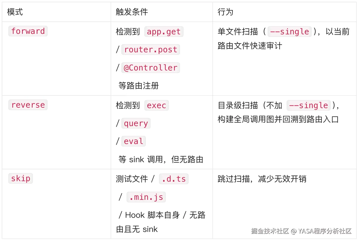 req.query)、哪些是危险汇聚点(如child_process.exec),YASA 在调用图上追踪污点流动路径 - 两种扫描模式: