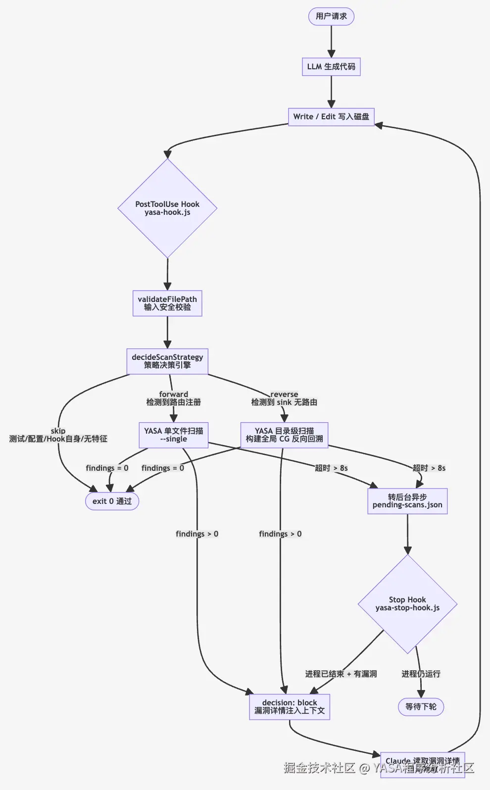 0个问题放行,>0个问题立即decision:block。 - 若超过阈值:将同一扫描任务转为后台进程继续运行,并把任务元数据写入