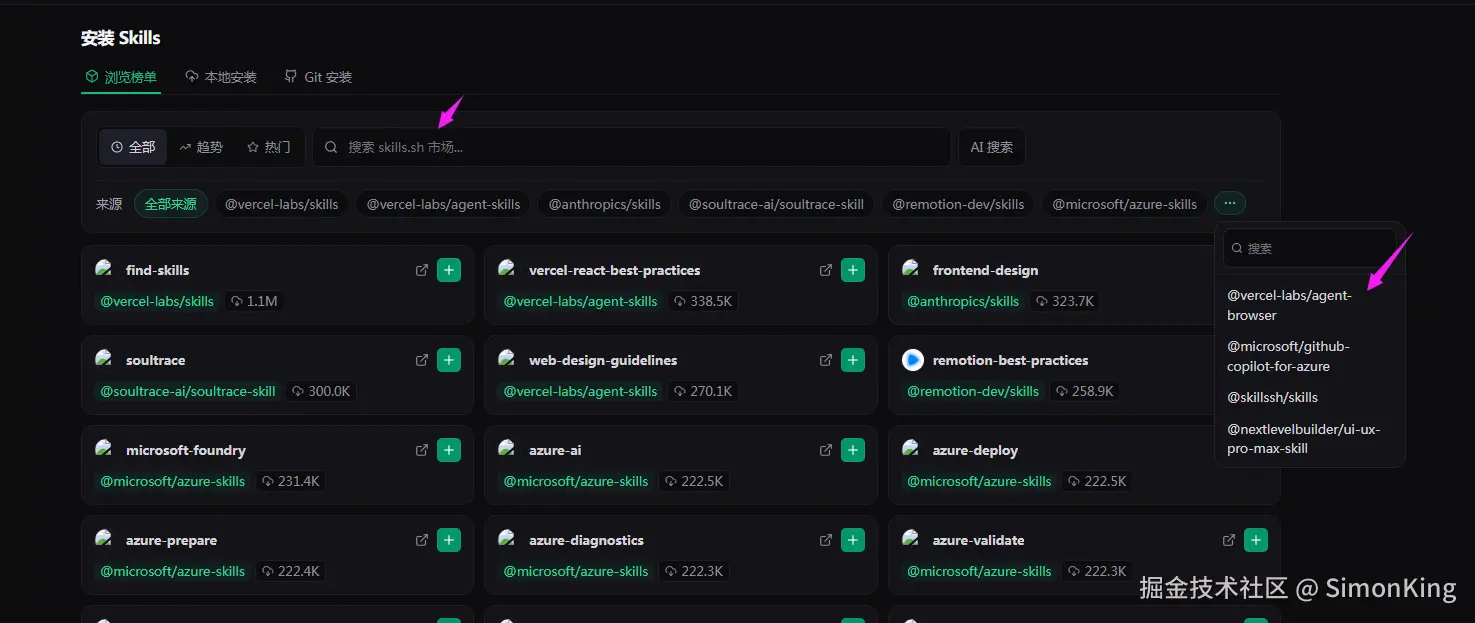 可以直接搜索skill安装。这里收录了众多的skills库。