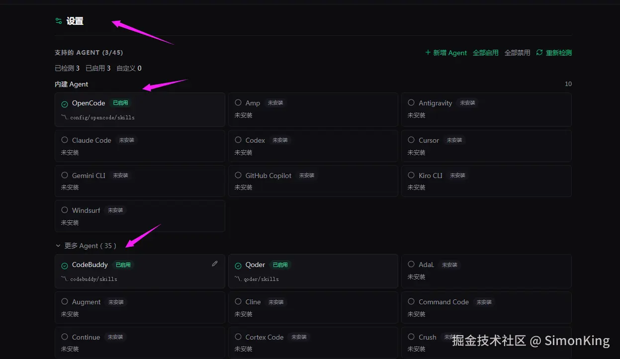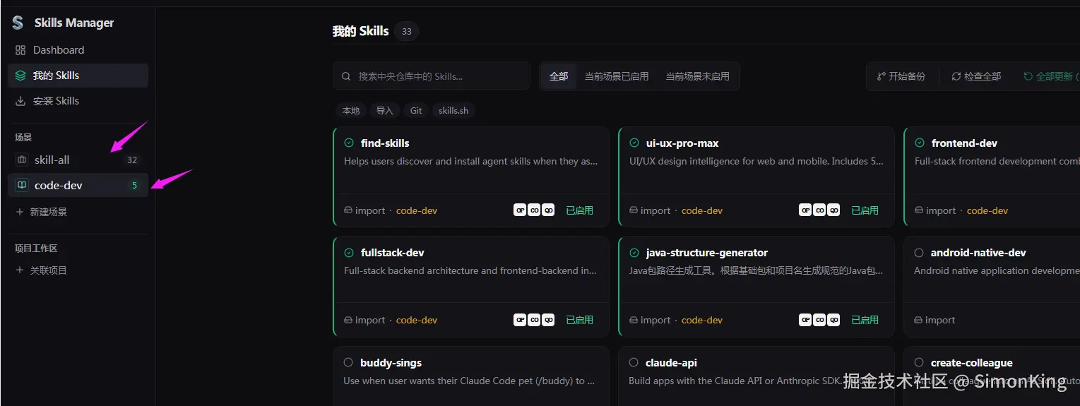 比如我一共导入了32个Skills,我并不想所有的客户端都可全部使用一样的。opencode客户端日常做一些繁琐的任务,可以使用所有的skills,但是Qoder和CodeBuddy用来日常Coding,只想用一些前端设计、后端设计的Skills。我们就可以通过场景区分。