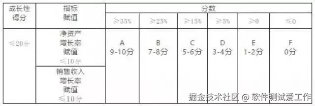 以上两个指标分别对照下表评价档次(ABCDEF)得出分值,两项得分相加计算出企业成长性指标综合得分。