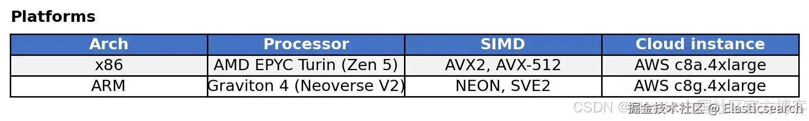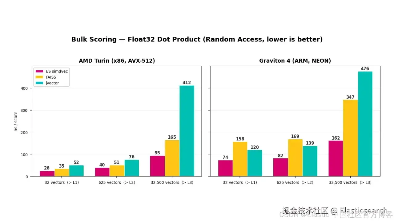 这体现了“自研内核库”的实际优势:当 Elasticsearch 扩展到 Graviton 平台时,我们可以直接加入专门优化的 NEON 内核。而 jvector 和 FAISS 并没有在 ARM 原生代码上投入同样的优先级。