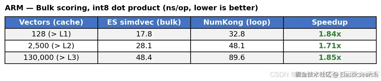 因此我们构建了 simdvec:一个手工调优的原生 C++ 内核库,通过 FFI 从 Java 调用,支持批量评分、预取,以及 Elasticsearch 使用的所有向量类型。通过掌控这个库,我们可以控制整个技术栈。当我们引入像 BBQ 这样的新量化类型时,它会配套一个经过优化的 SIMD 内核,并贯穿整个系统。我们无需等待上游库支持,也不需要在任何类型上牺牲性能。Elasticsearch 中的每一次向量查询——无论是 HNSW、IVF、重排序还是混合检索 —— 都运行在这个引擎之上,该引擎围绕我们实际使用的操作和类型构建。