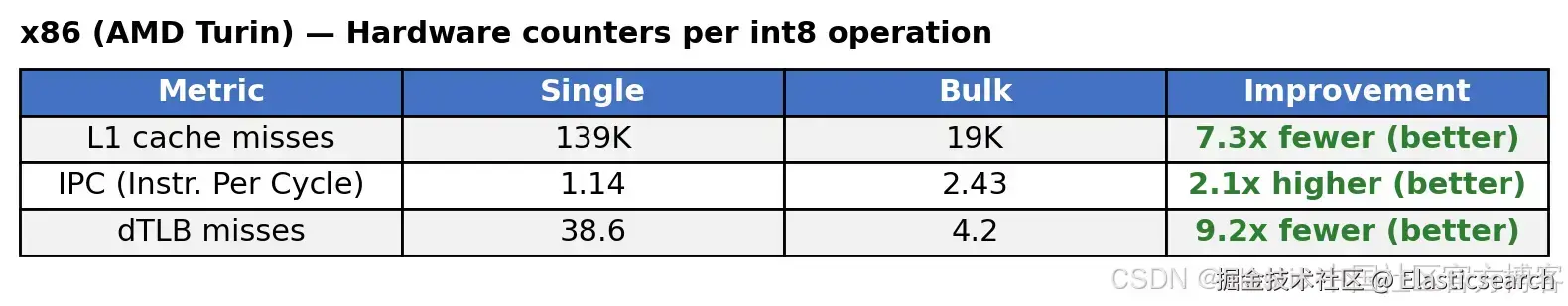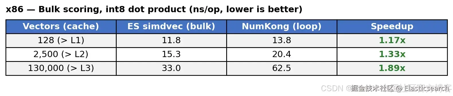 Elasticsearch simdvec 是 Elasticsearch 中每一次向量距离计算背后的引擎。它为 Elasticsearch 支持的每种向量类型提供手工优化的 AVX-512 和 NEON 内核。其批量评分(bulk scoring)架构通过在 x86 上进行显式预取(prefetching)以及在 ARM 上进行交错加载(interleaved loading)来隐藏内存延迟,当数据超出 CPU cache 时,其性能相比 FAISS 和 jvector 最多可提升 4 倍。在本文中,我们将解释为什么构建它、其内部原理,以及它如何让 Elasticsearch 的向量搜索成为世界上最快之一。