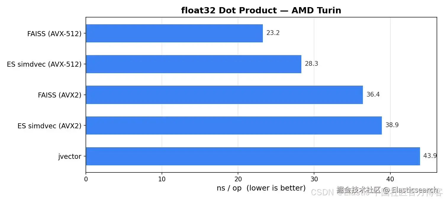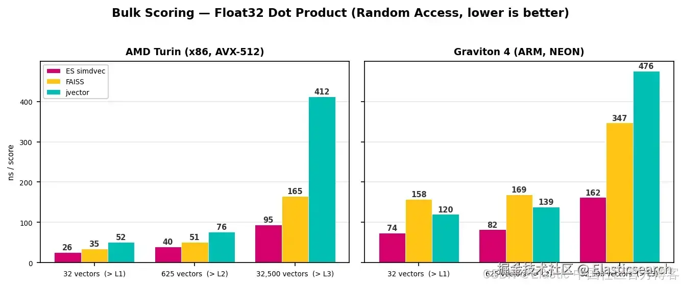 这两种框架都会在预热和迭代校准后,以 “每次操作的纳秒数” 作为指标进行报告。我们还通过硬件性能计数器验证了所有库在两个平台上都确实使用了 SIMD。所有基准测试代码都已公开,可在对应的 GitHub 仓库中查看(simdvec 的代码也包含在 Elasticsearch 仓库中)。