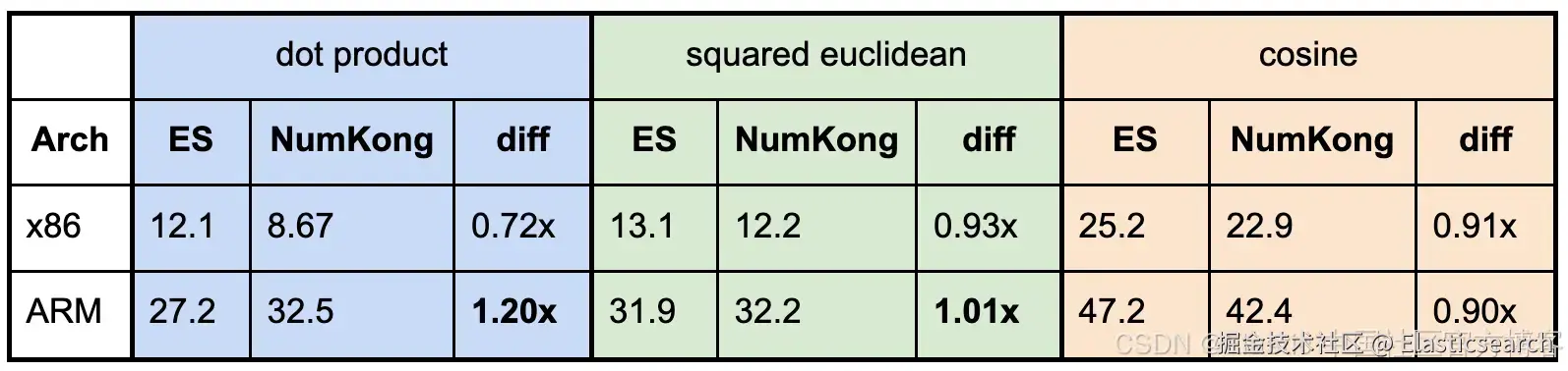 平方距离和余弦的结果也呈现类似模式:ARM 上加速比为 1.4x 到 1.8x,x86 上为 1.3x 到 3.0x(详情见此)。