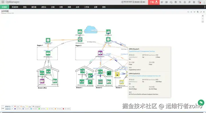 OpManager提供从物理层到应用层的完整网络视图,包括二层拓扑图、3D机架视图以及业务视图。其"智能网络发现"功能可自动识别并映射SDN、SD-WAN等复杂架构,大幅减少人工干预。特别值得一提的是,OpManager的"业务视图"功能允许管理员根据业务需求自定义设备分组,直观展示设备对业务的影响程度,使网络管理从技术层面提升到业务层面。