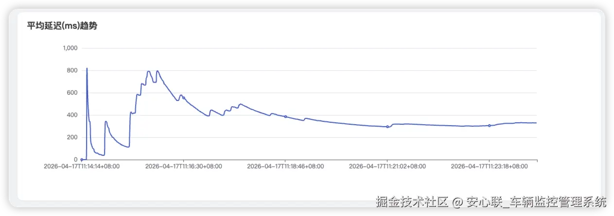国标车载业务对消息时延敏感度极高,车辆定位、报警信息、轨迹数据的上报时效,直接决定监管应急响应效率。延迟曲线全程走势清晰: