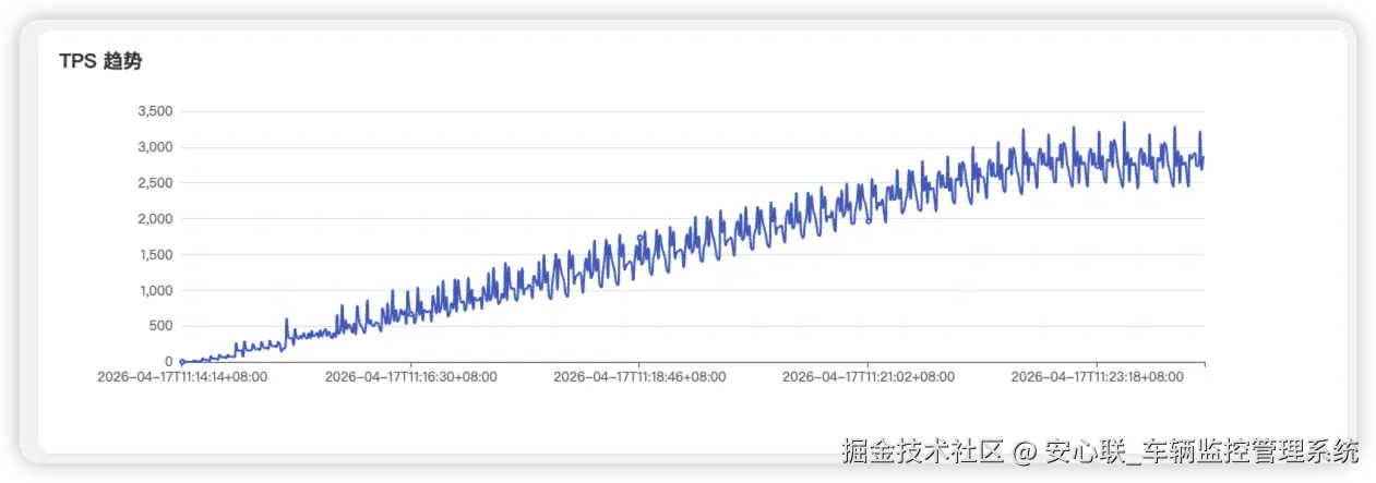 TPS(每秒消息处理事务数)曲线全程持续向上攀升,伴随在线车辆增多、上报消息密度提升,系统吞吐同步平稳上涨,最终稳定在 3356 峰值 TPS。曲线全程无剧烈抖动、无断崖式下跌、无处理能力瓶颈卡顿,证明系统消息分发、报文解析、业务路由架构设计优秀,可从容应对海量终端集中上报、业务消息洪峰场景。