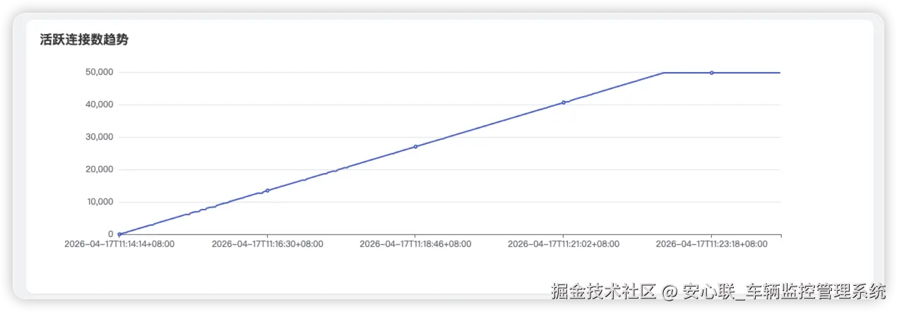 车载监控业务的核心根基是 TCP 长连接常驻,车辆 7×24 小时在线、不间断联网监管,全依赖平台长连接承载能力。从连接数趋势曲线可见:系统以 100 路 / 秒的设定速率平稳爬坡建连,活跃连接数持续线性增长,最终稳稳触达近 5 万终端满额在线;连接数封顶后全程保持平直稳定,无连接断崖、无批量掉线、无内存溢出导致的连接断开,充分验证系统长连接架构的稳定性,完美适配营运车辆、固废运输车辆全天候不间断在线监管需求。