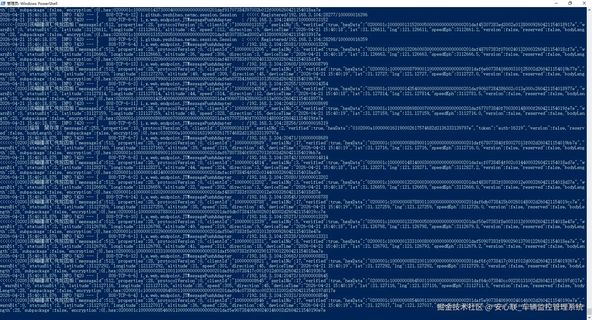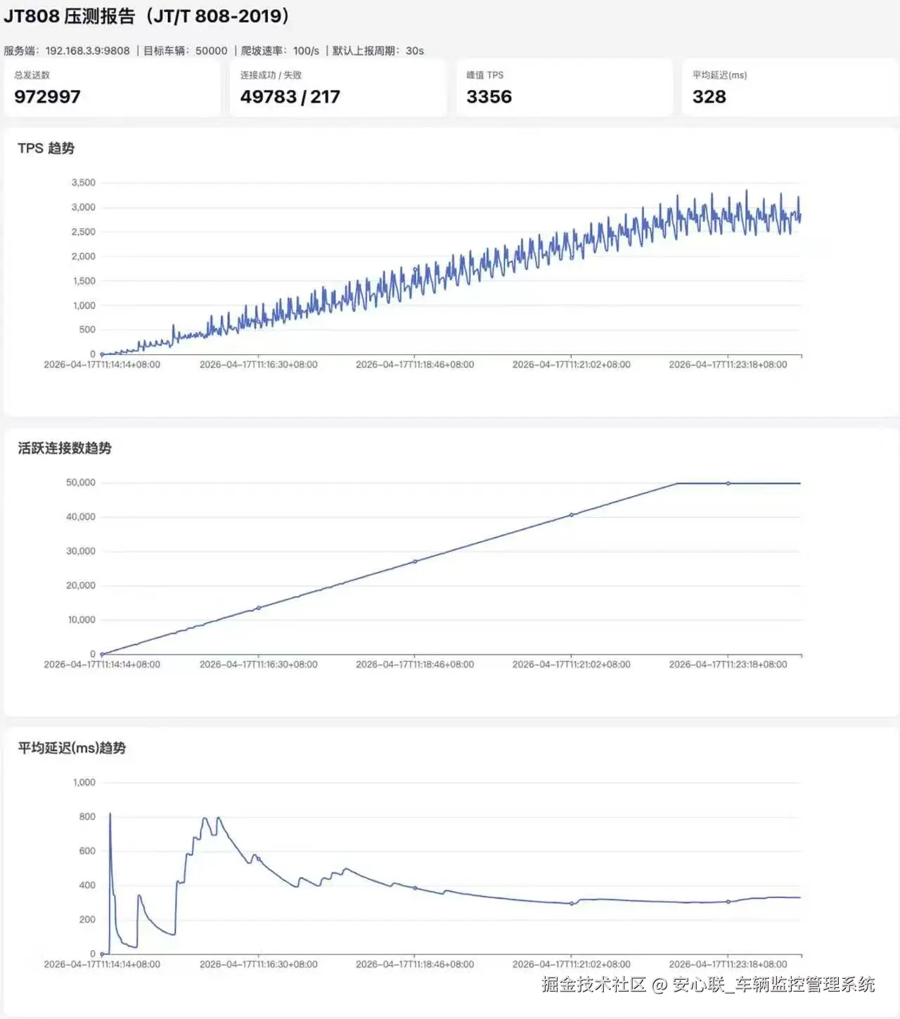 - 峰值业务吞吐 TPS:3356 TPS(代表系统每秒可稳定处理超 3300 条国标 JT808 车载报文,含定位上报、心跳、报警、车辆信息上报等全类型业务消息)