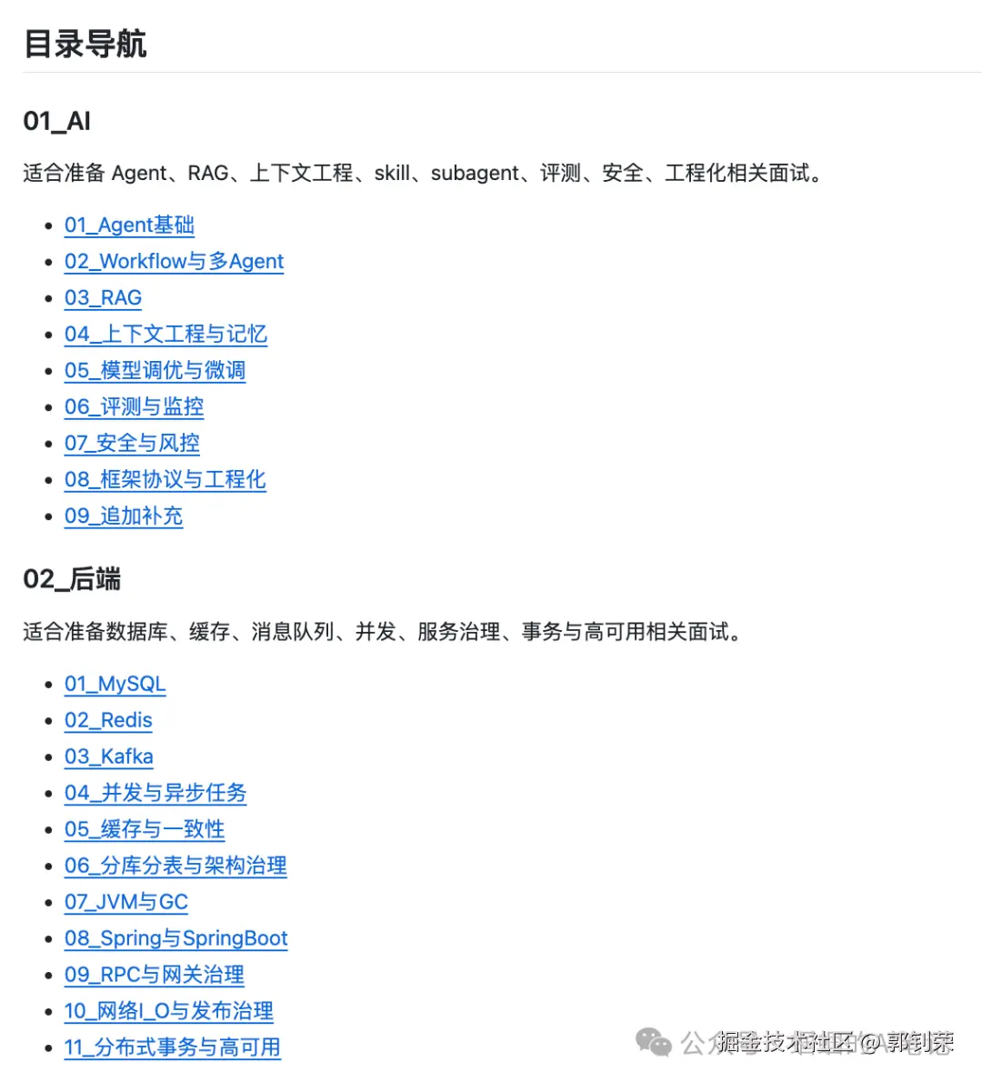 这个仓库不是题库,不适合无脑硬刷。它更像一个复习地图——告诉你哪些方向要重点准备,每个方向的核心问题是什么,以及怎么把技术能力转化成面试里能说清楚的表达。