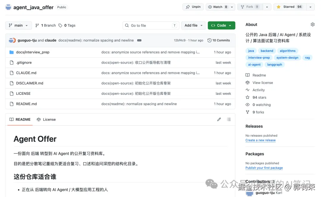 最近几天我把过去备战 AI Agent 岗位时积累的复习笔记,整理成了一个公开的 GitHub 仓库.