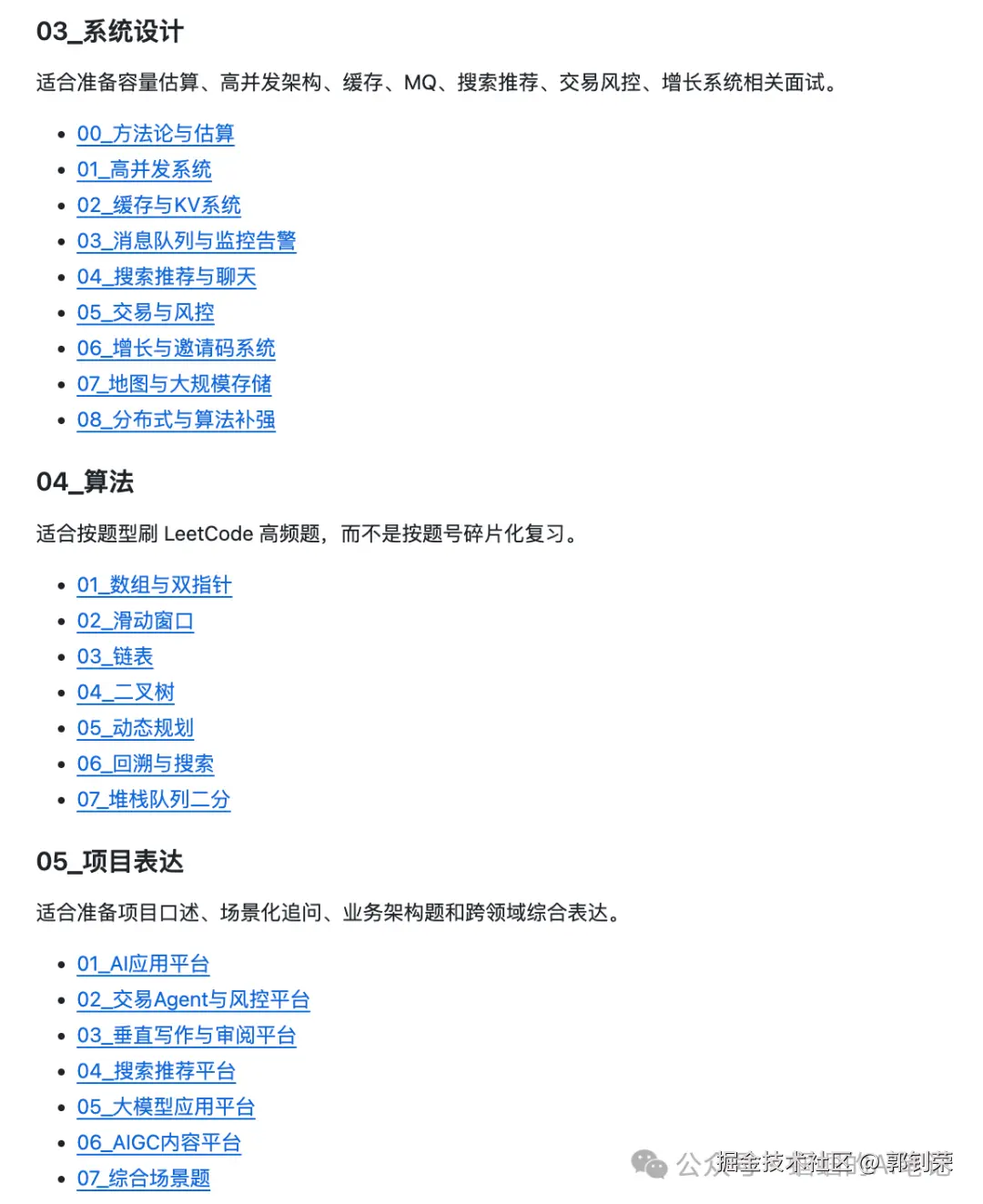 03_系统设计 覆盖了容量估算、高并发、缓存、搜索推荐、交易风控、增长系统这些大厂最爱考的场景题。