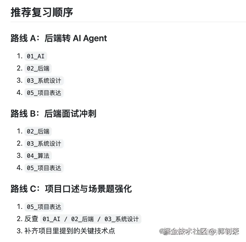先 01_AI,再 02_后端,再 03_系统设计,最后 05_项目表达
