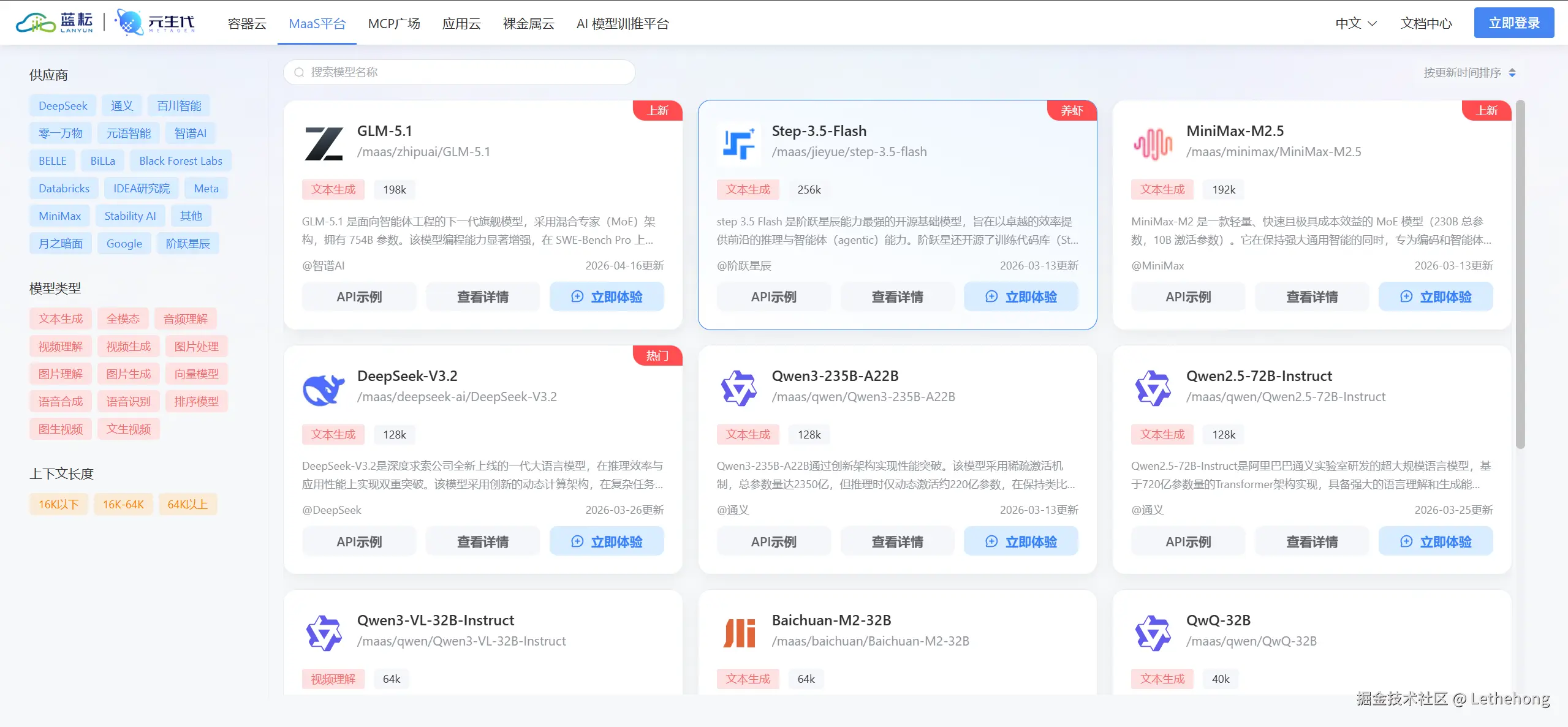 ·蓝耘:目前官网24款模型,主要是DeepSeek、Qwen、GLM、MiniMax、Kimi等主流商用模型。数量虽然不多,但如果你生产环境只需要2-3个核心模型,这个数量完全够用。