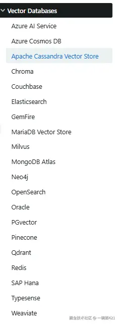 把文档保存到向量数据库中,目前springai支持的向量数据库已经有很多了。使用对应的向量库需要引入对应的依赖,可以前往官网查询 :docs.spring.io/spring-ai/r…