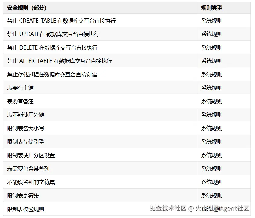 DROP/TRUNCATE TABLE、DELETE进行未带WHERE的条件的高危操作,从源头杜绝删库、误删风险。大查询限制:限制单次查询返回的最大行数、扫描的最大数据量,避免 Agent 发起低效高频查询,占用数据库资源。