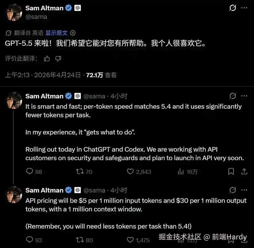 在4月24日凌晨,Sam Altman 亲自官宣:GPT‑5.5 正式上线。