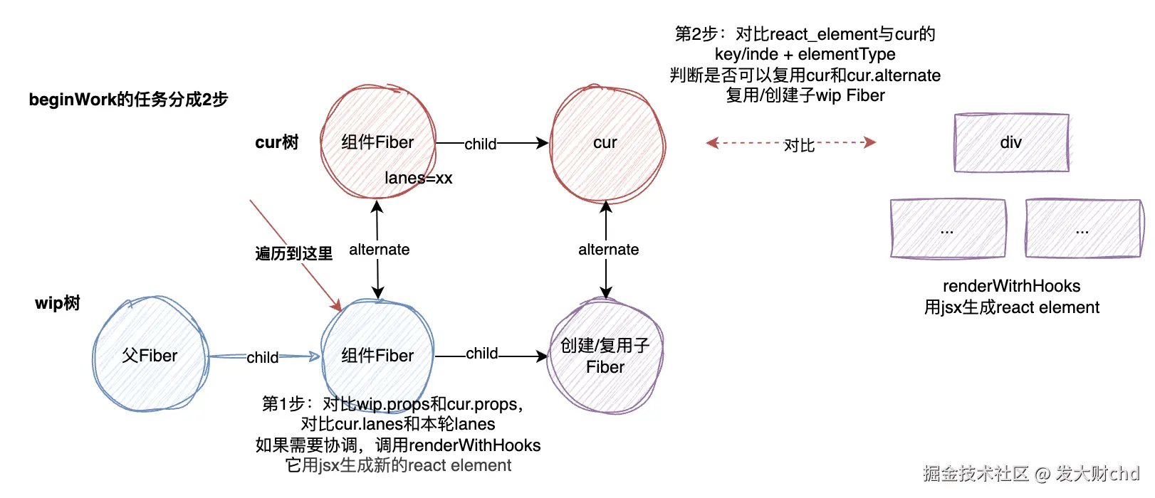 而,“协调”是指父组件发生了变化(props)或者组件自身状态发生变化(lanes),出现一个任务,例如等于lanes = 1(=SyncLane,同步任务),如果是元素类型,元素发生了变化(props),子树不能跳过协调———需要“查询”与react element相同的cur 子节点。 & Diff cur子树与新wip子树。