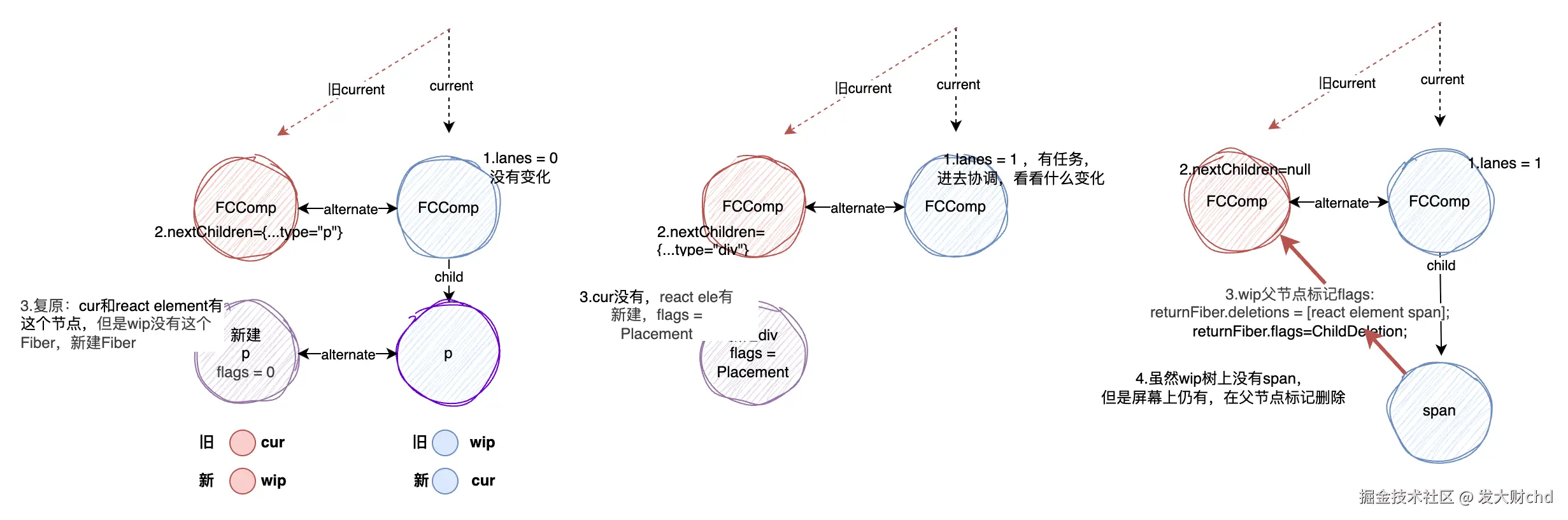 总之,它们都是先看有没有cur,再看有没有cur.alternate。复用可以复用的wip Fiber,否则新建新的wip Fiber。 区别是,“快速退出”的cur子树和需要构建的wip子树是一样的,所以不需要看有没有cur,只看有没有cur.alternate。