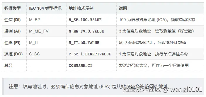 类型.信息对象地址.属性。信息对象地址 (IOA) 必须与从站设备定义的点表一致。