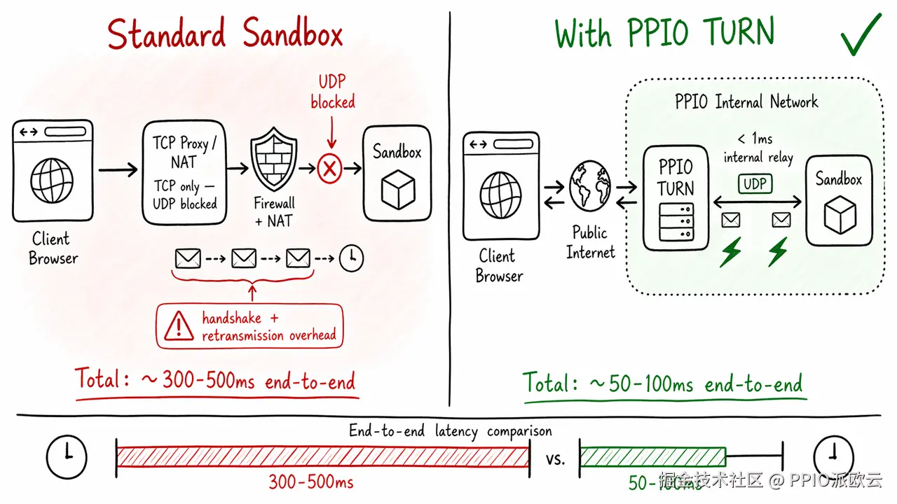 更关键的是,PPIO 的 TURN 服务与沙箱运行在同一内网域内。常见的替代方案——自建 coturn 或使用外部第三方 TURN——服务器与沙箱不在同一机房,每次中继都要额外经过一次跨机房路由,带来 20-50ms 的固定延迟开销。PPIO TURN 与沙箱共享内网,这段开销直接消失。