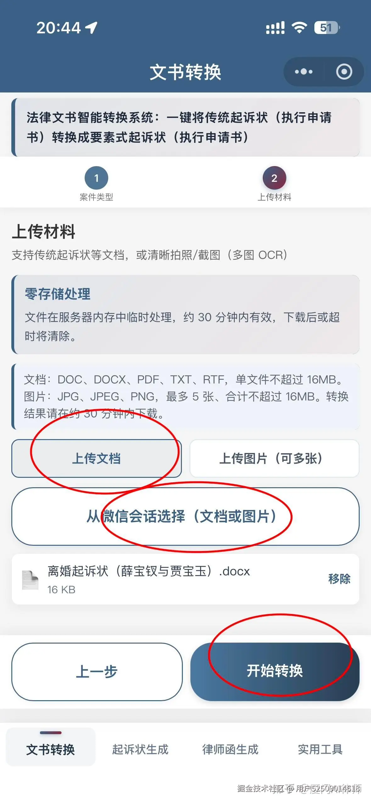 第三步:上传传统起诉状:根据情况选择上传文档或上传图片。文档仅能从微信聊天记录中上传,图片可以从微信聊天记录中上传,也可以从相册中上传,还可以用手机中的照相机拍摄。文档或图片上传后点击“开始转换”: