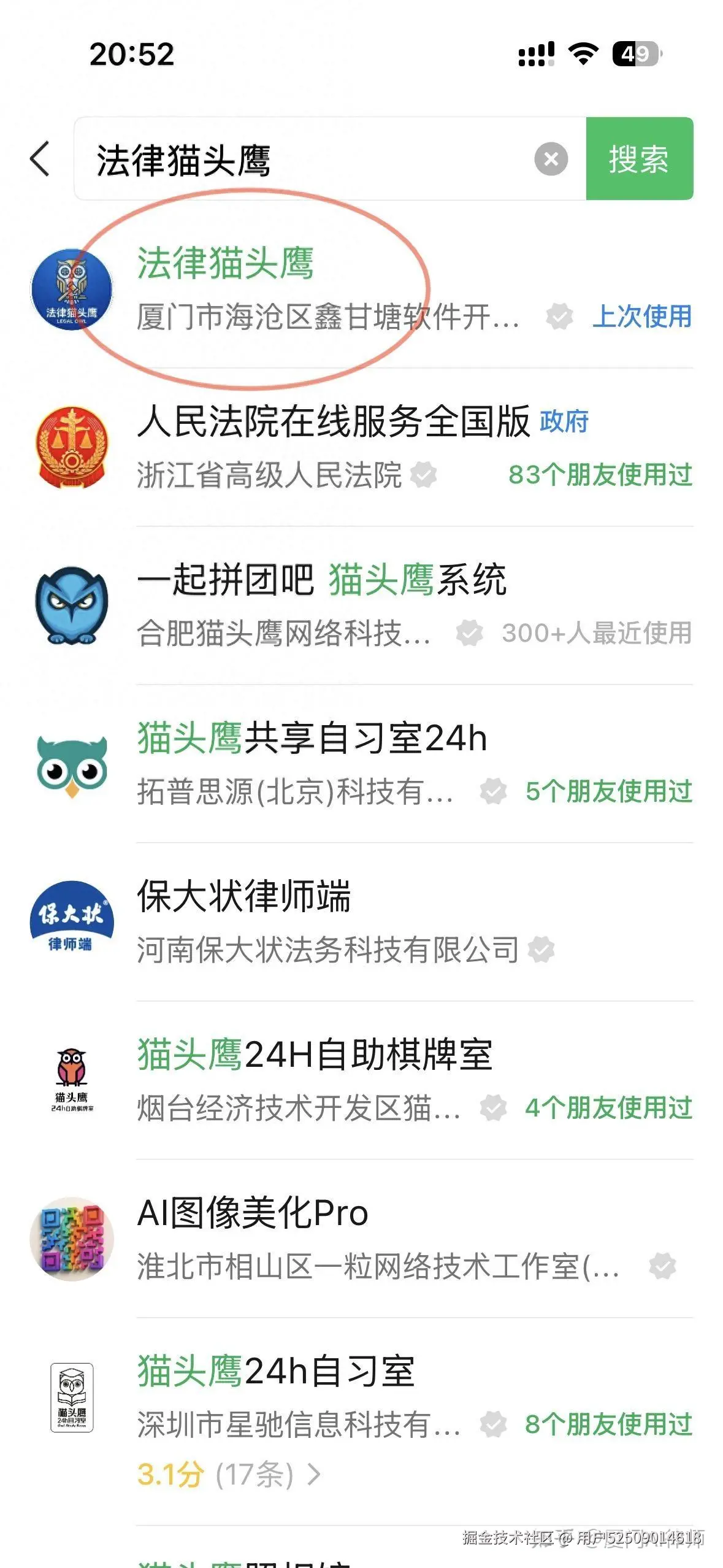 第一步:搜索并打开微信小程序:法律猫头鹰:
