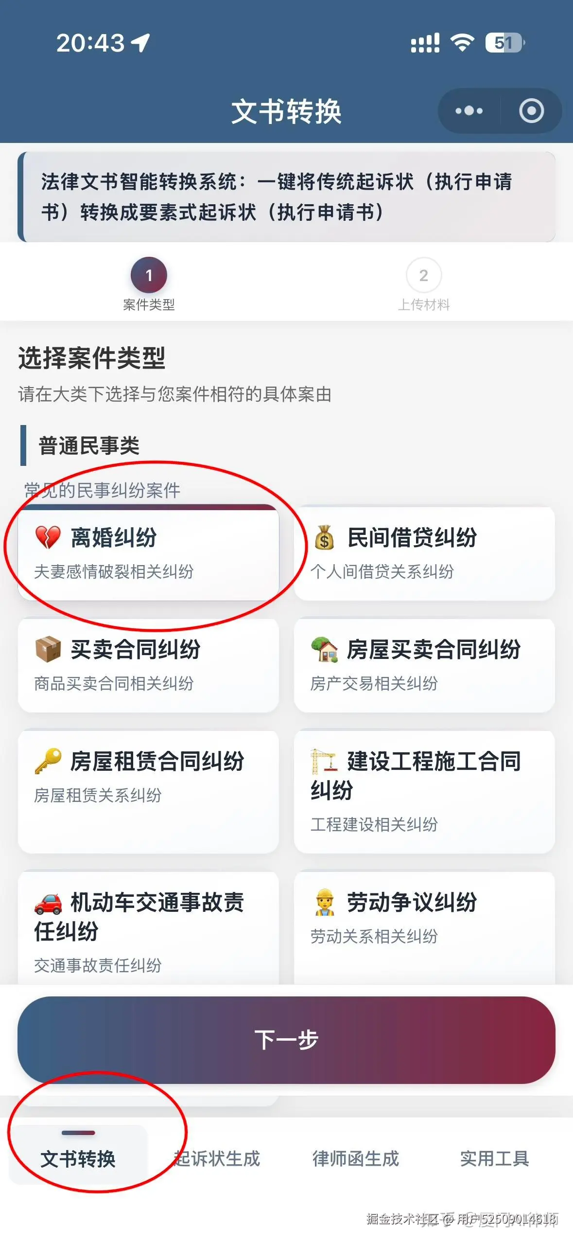 第二步:点击底部的“文书转换”,选择案件类型;这里我们以转换离婚纠纷起诉状为例,选择“离婚纠纷”: