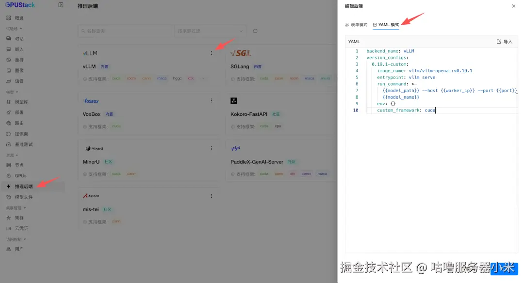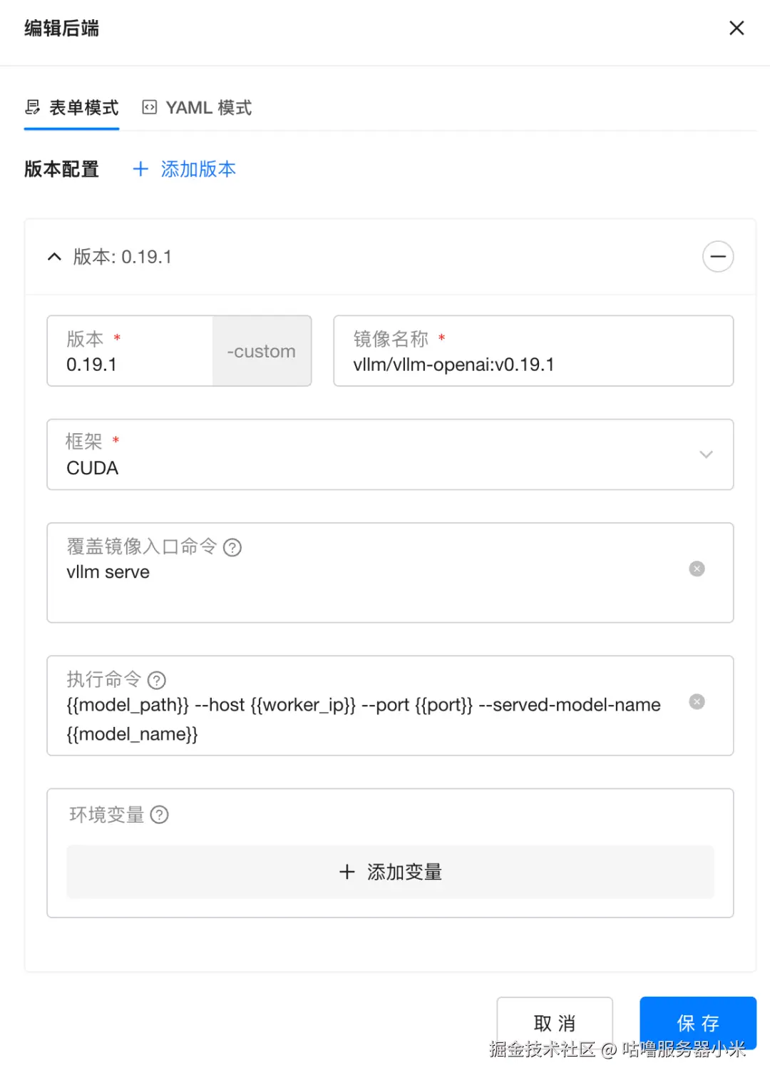 也可以切换到 YAML 模式,直接使用以下的 YAML 导入(公众号复制可能存在特殊格式,可以发送给 AI 重新整理 YAML 格式):vLLM