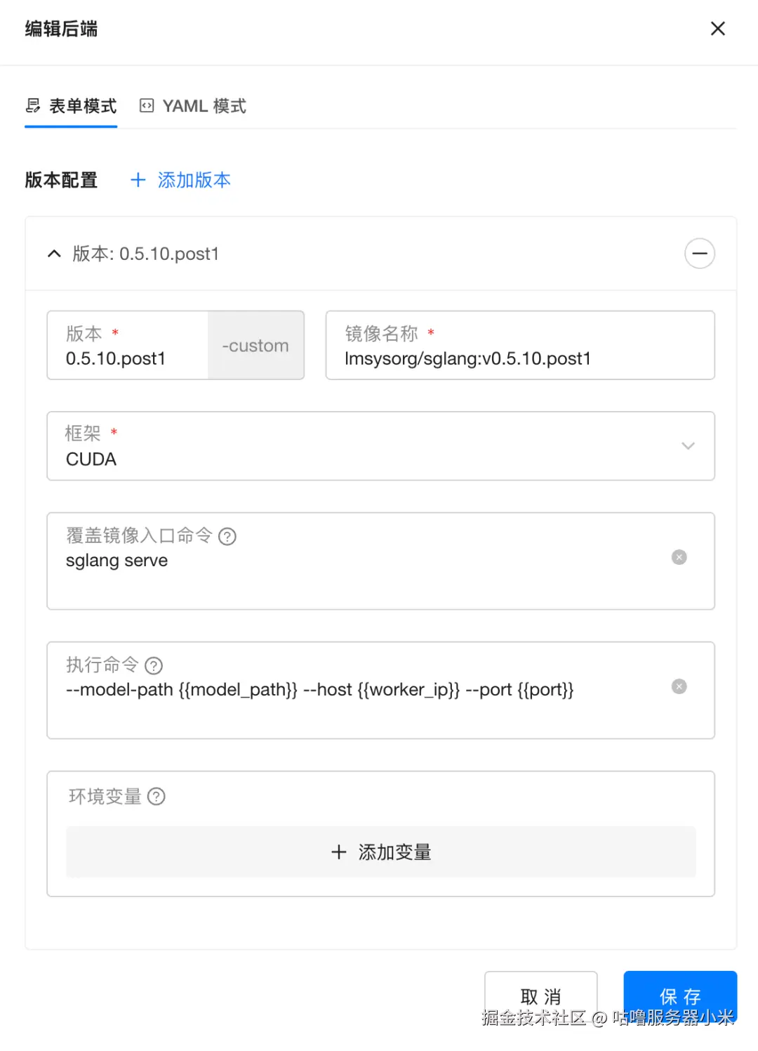在推理后端菜单,编辑 SGLang,在版本配置中选择添加版本,添加一个新的 SGLang 版本,指向 SGLang 官方镜像自定义添加 SGLang 0.5.10.post1 配置如图所示: