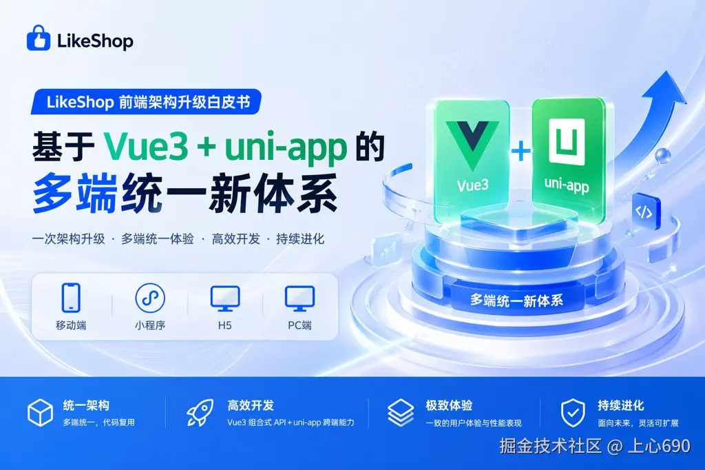 LikeShop 选择 uni-app + Vue3 的前端架构,本质不是技术偏好,而是面向商城业务的现实最优解: