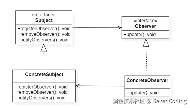 主题(Subject)具有注册和移除观察者、并通知所有观察者的功能,主题是通过维护一张观察者列表来实现这些操作的。