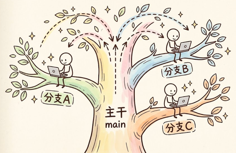 而且多人协作开发时,每个人可以拉一个自己的 分支,就像从主干上长出的树枝,各写各的互不影响,写完再合并回主干。