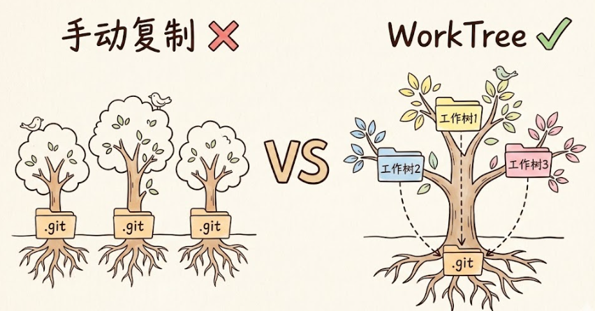 你兴奋地搓搓手:所以有了 WorkTree,AI 们各自在独立的文件夹里干活,不会打架;合并代码时也不用手动复制粘贴了,一举两得啊!