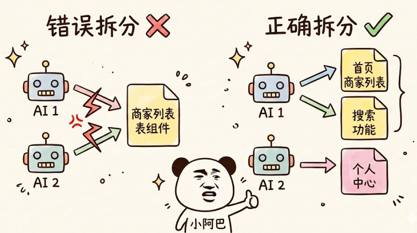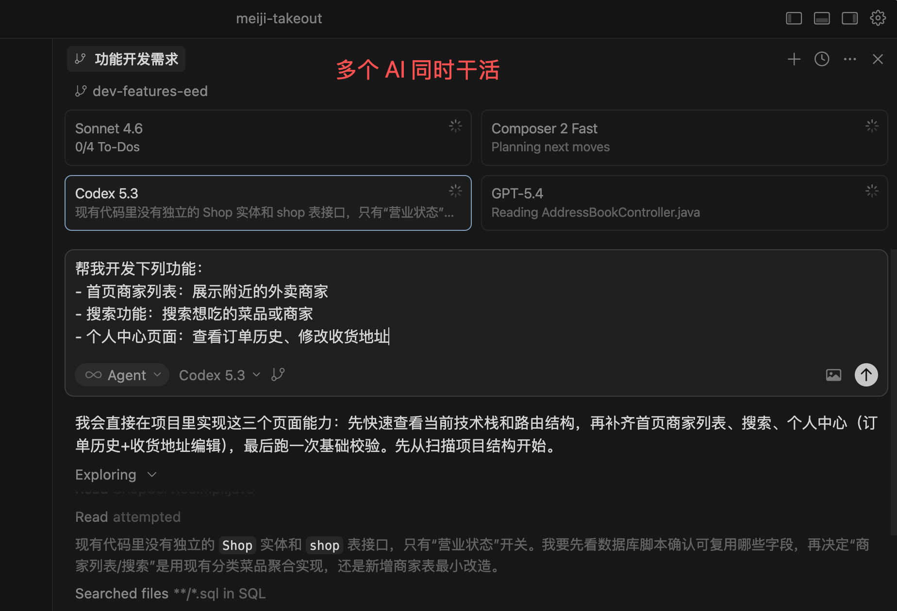 鱼皮:所以分配任务时,要尽量让不同的 AI 改不同的文件。比如刚才的首页商家列表和搜索功能,都会用到 “商家列表” 这个组件,就不适合拆给两个 AI 分别做,最好交给一个 AI 一把梭。而个人中心是独立的模块,可以放心交给另一个 AI。