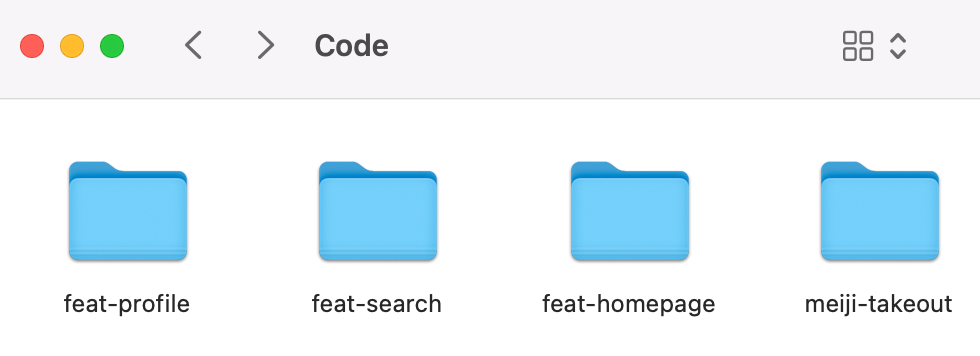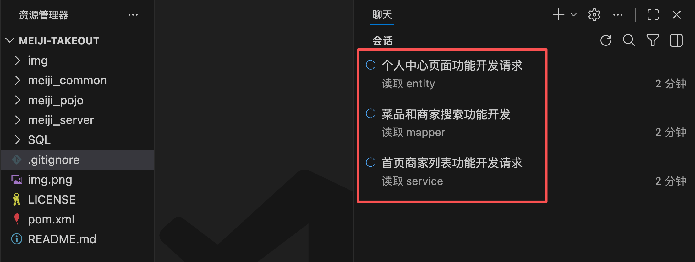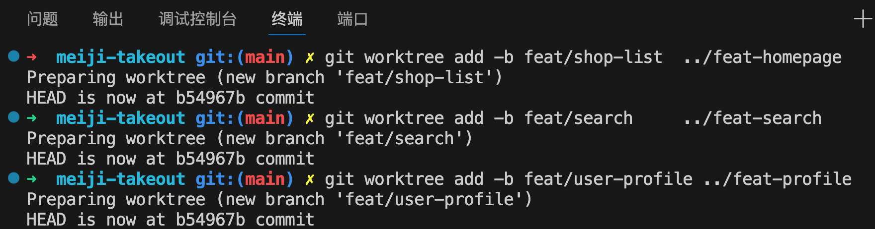 比如你的项目在 meiji-takeout 文件夹,想同时搞首页商家列表、搜索功能和个人中心这 3 个功能,可以创建 3 个工作树,分别对应 3 个功能分支: