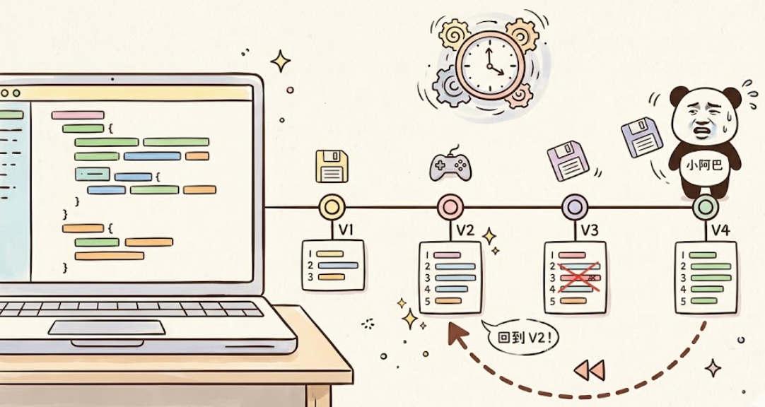 当你用 Git 管理项目时,每次保存代码都会形成一个 版本,就像游戏里的存档点。如果写错了代码,随时可以回到之前的版本,再也不怕 AI 把项目搞崩了。