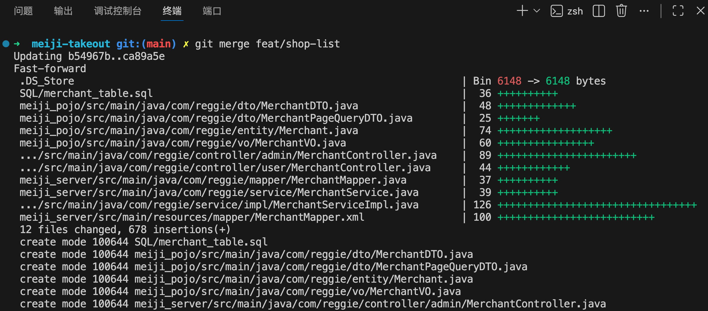 2)接着切回主分支,用 git merge 命令把各个功能分支的代码依次合并进来就行了。