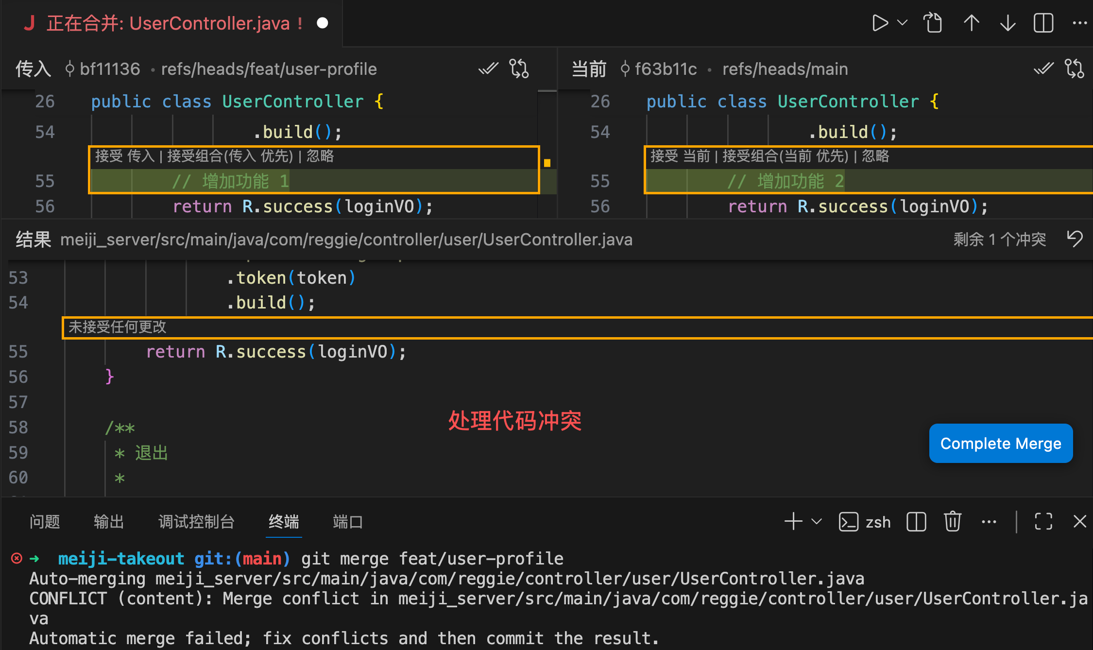 鱼皮:那在合并的时候会产生 冲突,Git 会提示你哪些地方有冲突,需要你手动决定保留谁的代码、删掉谁的代码。