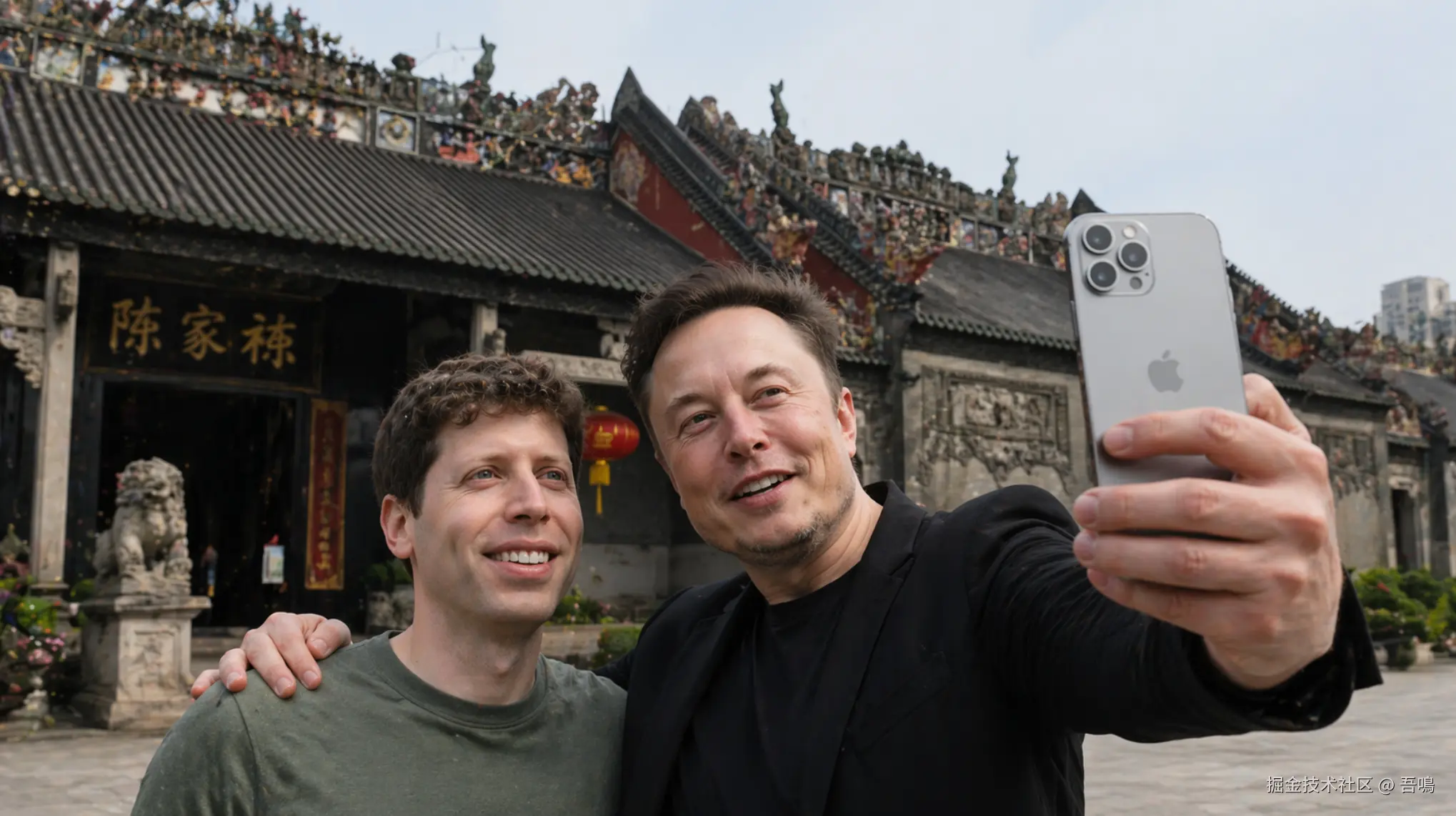 马斯克和萨姆·奥特曼搭着肩在广州陈家祠景点门口前举着IPhone 16 Plus自拍,背景需要是广州陈家祠,写实摄影风格,图片比例是16:9,横屏