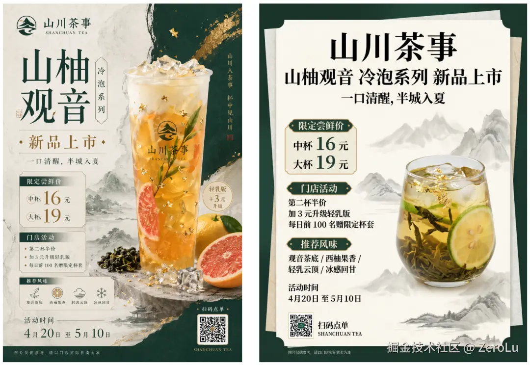 为一款新的中国新式茶饮上新设计一张 3:4 竖版海报。使用一种轻奢、克制的新中式视觉风格。配色应为深绿色、米白色和金色,并带有宣纸纹理、优雅留白、山水点缀和现代排版设计。
