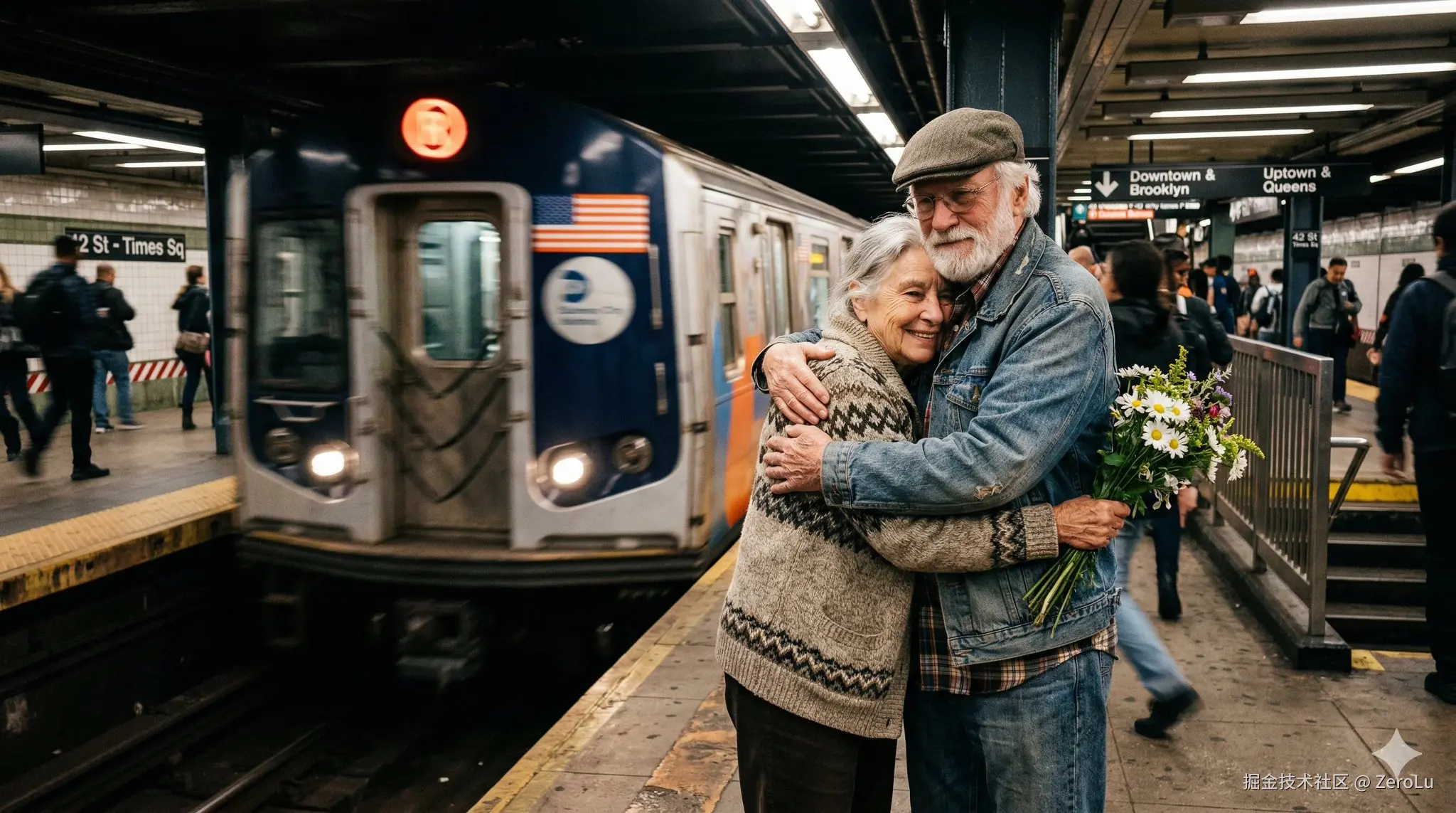 创建一张完全 RAW 质感、未经处理、未经编辑、具有完整 iPhone 相机画质的图片。场景是美国的一座地铁站,带有一瞬间的模糊感。地铁正在行驶中。地铁前方站着一位老妇人和一位老先生。