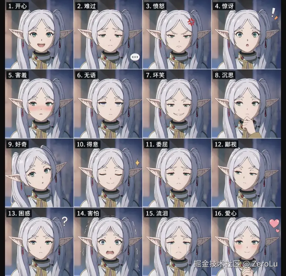 创建一张银发蓝眼动漫少女的 16 格表情图。她的脸型、发型和服装在所有格子中都必须保持高度一致。16 种表情应包括:开心、难过、生气、惊讶、害羞、无语、邪魅一笑、沉思、好奇、得意、委屈、轻蔑、困惑、害怕、哭泣,以及一个爱心表情。