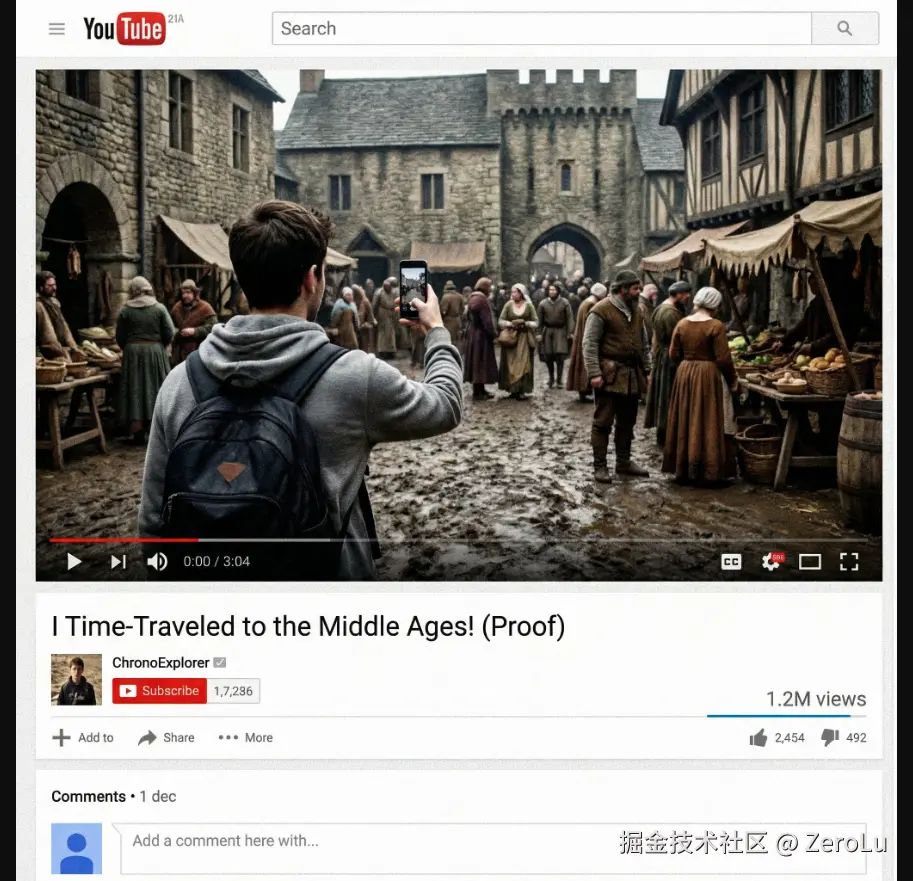 一张 YouTube 视频截图,内容是有人穿越到了中世纪